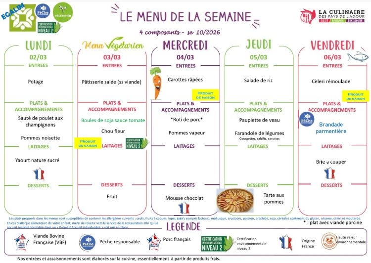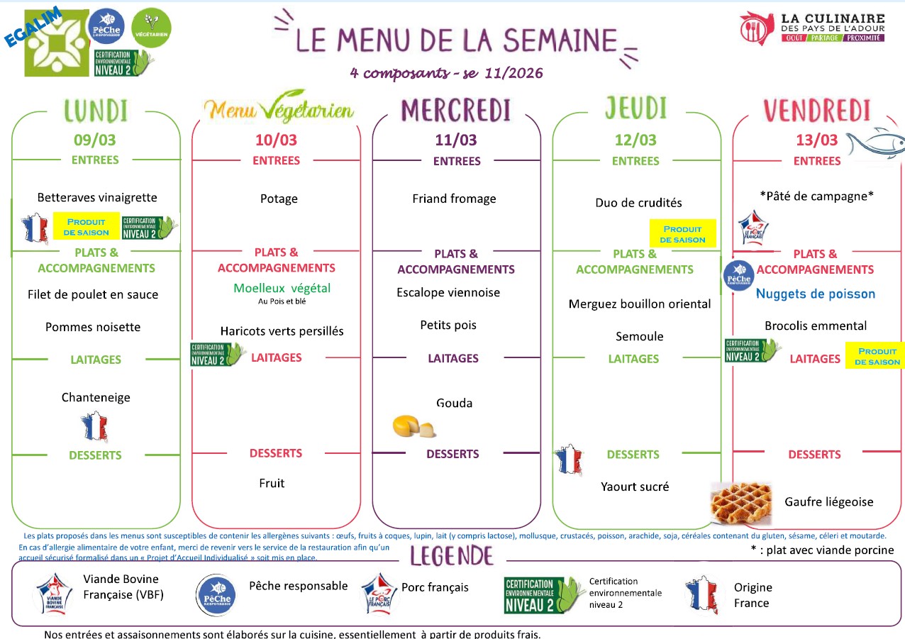Menu semaine 11 du 9 au 13 mars 2026